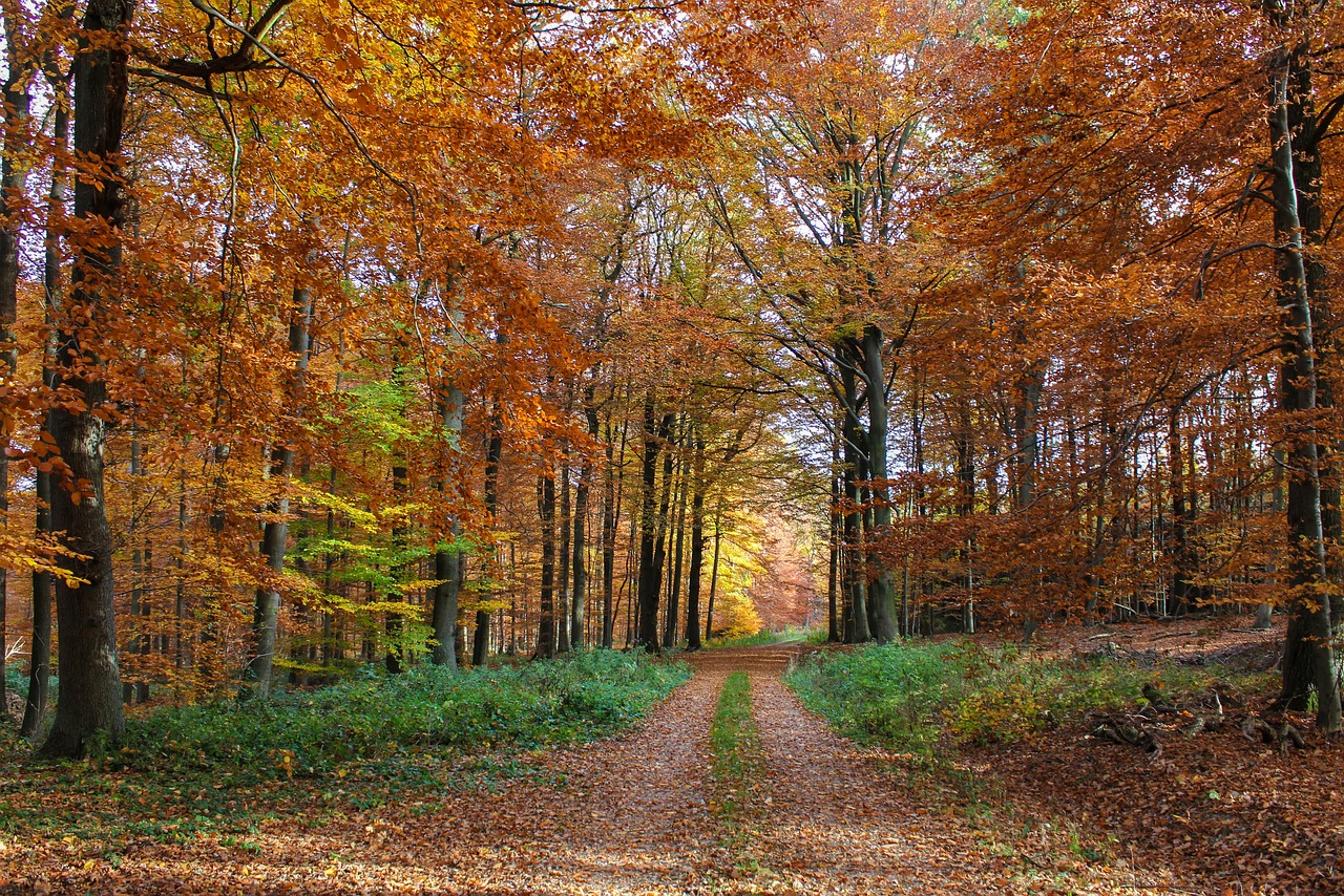 도로 양옆에 단풍나무가 길게 늘어서 있고,